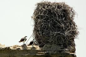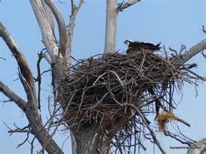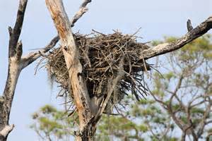 Ospreys want their nest sites out in the open for easy approach. They look for structures with a wide, sturdy base and safety from ground predators (such as raccoons). Nests are usually built in trees on snags, treetops, or crotches between large branches and trunks. Usually the male finds the site before the female arrives.