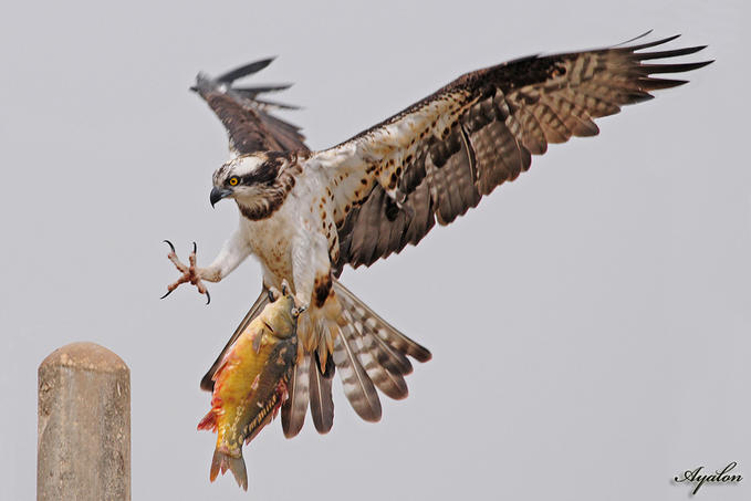 The osprey differs in several respects from other diurnal birds of prey. Its toes are of equal length, its talons are rounded, rather than grooved. The osprey and owls are the only raptors whose outer toe is reversible, allowing them to grasp their prey with two toes in front and two behind. This is particularly helpful when they grab slippery fish.