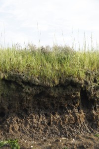 The soil of a Salt Marsh is composed of deep mud and peat. Peat is made of decomposing plant matter that is often several feet thick.  Every winter the salt marsh grasses die and add to the eons of waterlogged, root filled, spongy decomposing organic matter.   Anaerobic bacteria thrive, giving the marsh its unique aroma.