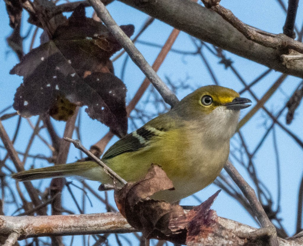 While buried in dense shrubbery, they belt out a scratchy “chick-burio-chick” song. More often heard than seen. Look for white eye, yellow eyebrow, olive back, gray breast, and yellow sides. Thick bill characteristic of vireos. Forages in scrubby areas, overgrown pastures, and forest edges for insects.
