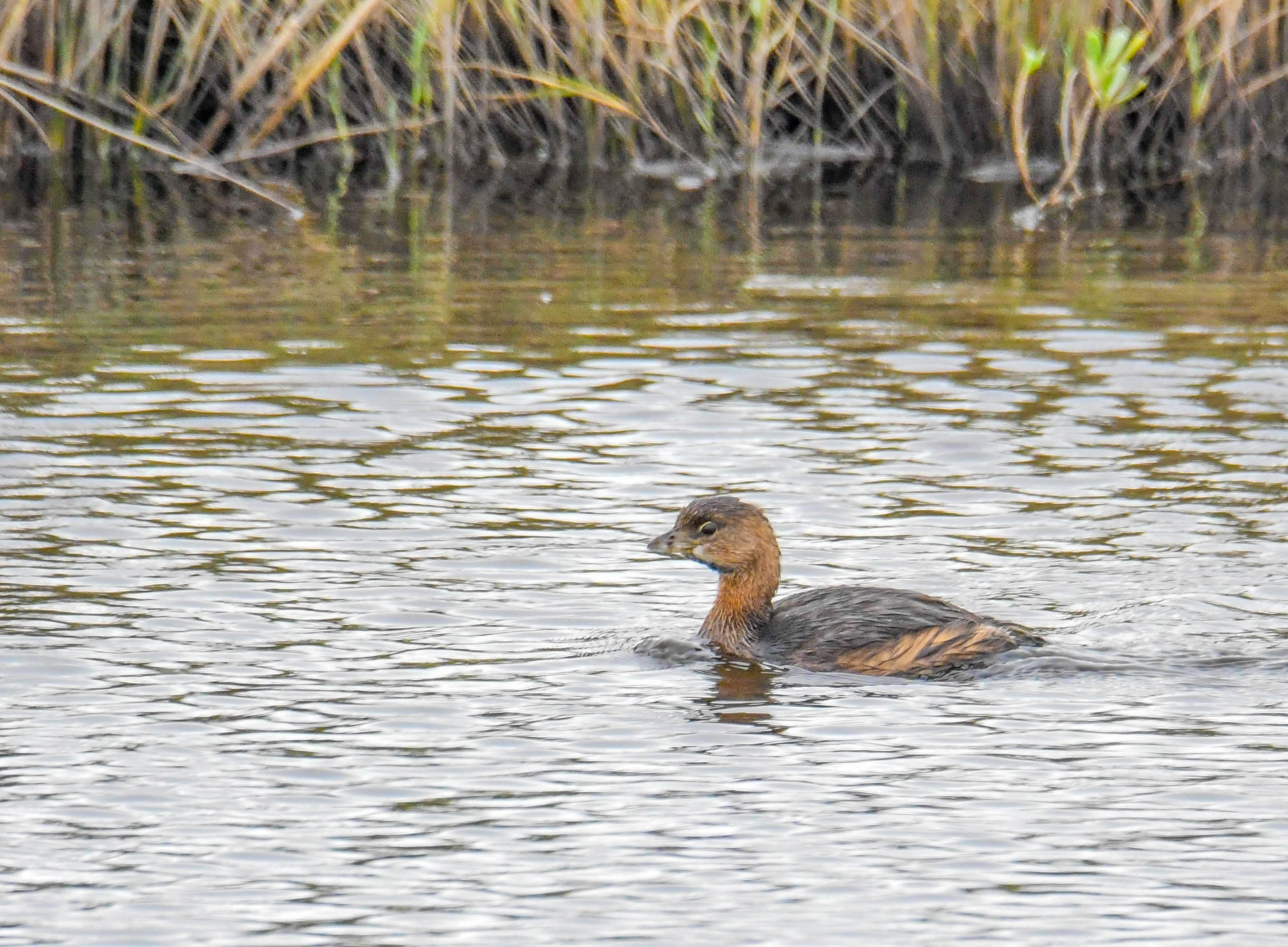 Is not a duck…Compact, small gray-brown body and a stubby bill. Shorter, rounder body than a duck. Inhabits ponds and marshes with emergent vegetation. Dives to feed mostly on fish. Black eyes.