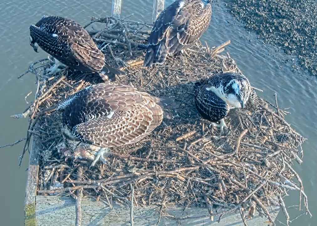 Four juveniles on the nest. Mary Anne is the best fisherperson. Plus she is Woke. And she does not share.