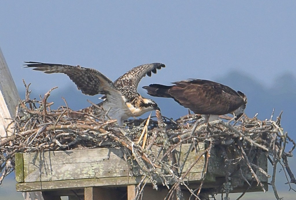 Juvenile osprey resembles adults, but have white tipped feathers on their back, giving them a speckled appearance. Juvenile osprey eyes are orange; as they mature they change to yellow.
